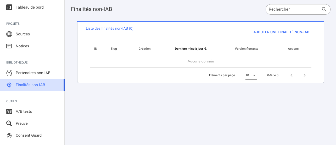 Soit depuis la page de création d'une source via le bouton "créer une finalité non IAB" ou depuis l'onglet "Finalités non IAB" via le bouton "Ajouter une finalité non IAB".